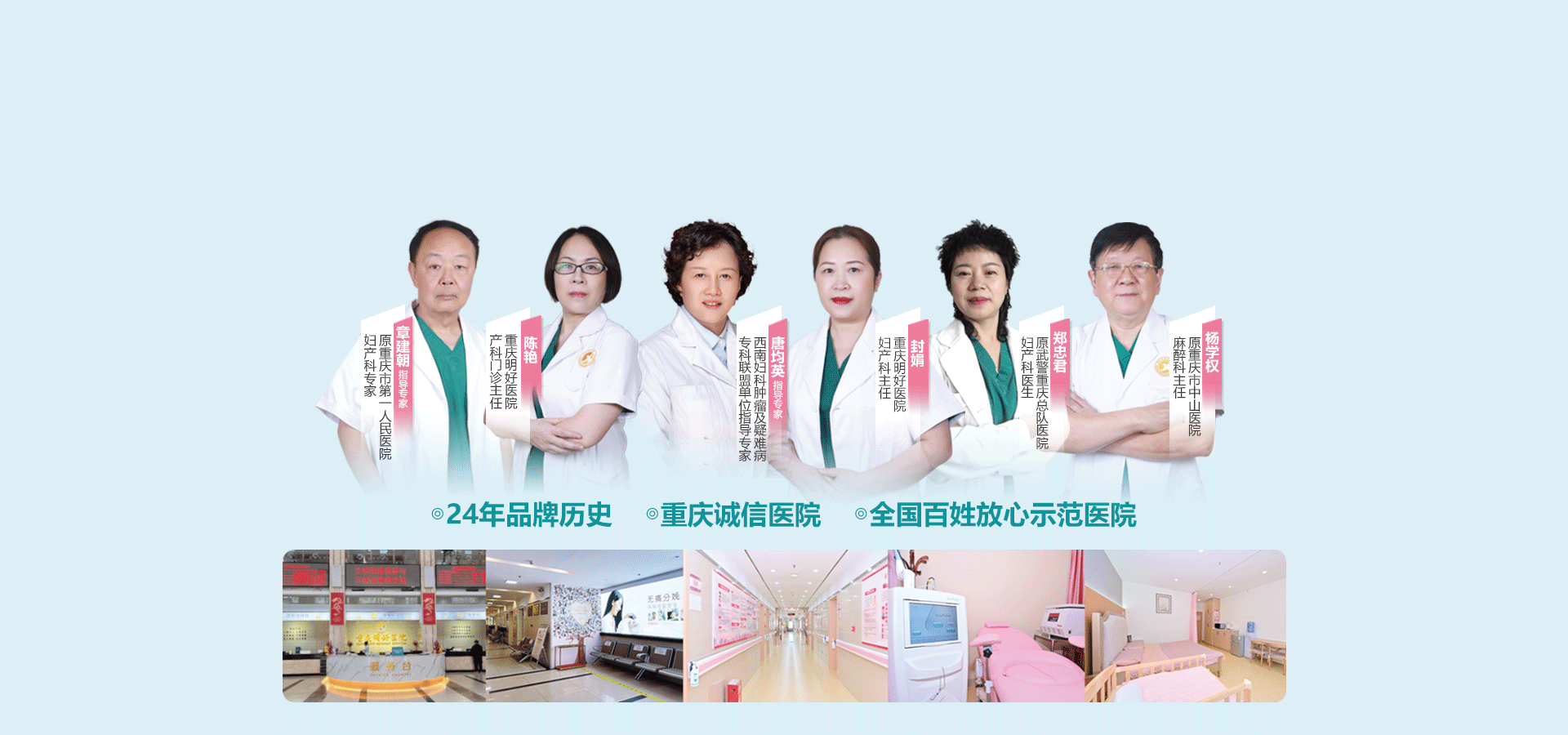科室由妇科、生殖不孕科、计生科、中医妇科、产后康复组成。重庆市妇幼学会非公专委会副主任委员、妇产科主任封娟领衔,云集了郑忠君、陈艳、张素英、郑三容等多位医生,组成一支老、中、青年骨干医护团队,重医附一院妇科主任唐均英教授,原重庆第一人民医院妇产科专家章建朝主任成为对口指导专家,并与上海市妇女病康复专业委员会共同建立西南妇女病康复技术指导基地,为女性朋友提供高质量的医疗服务。